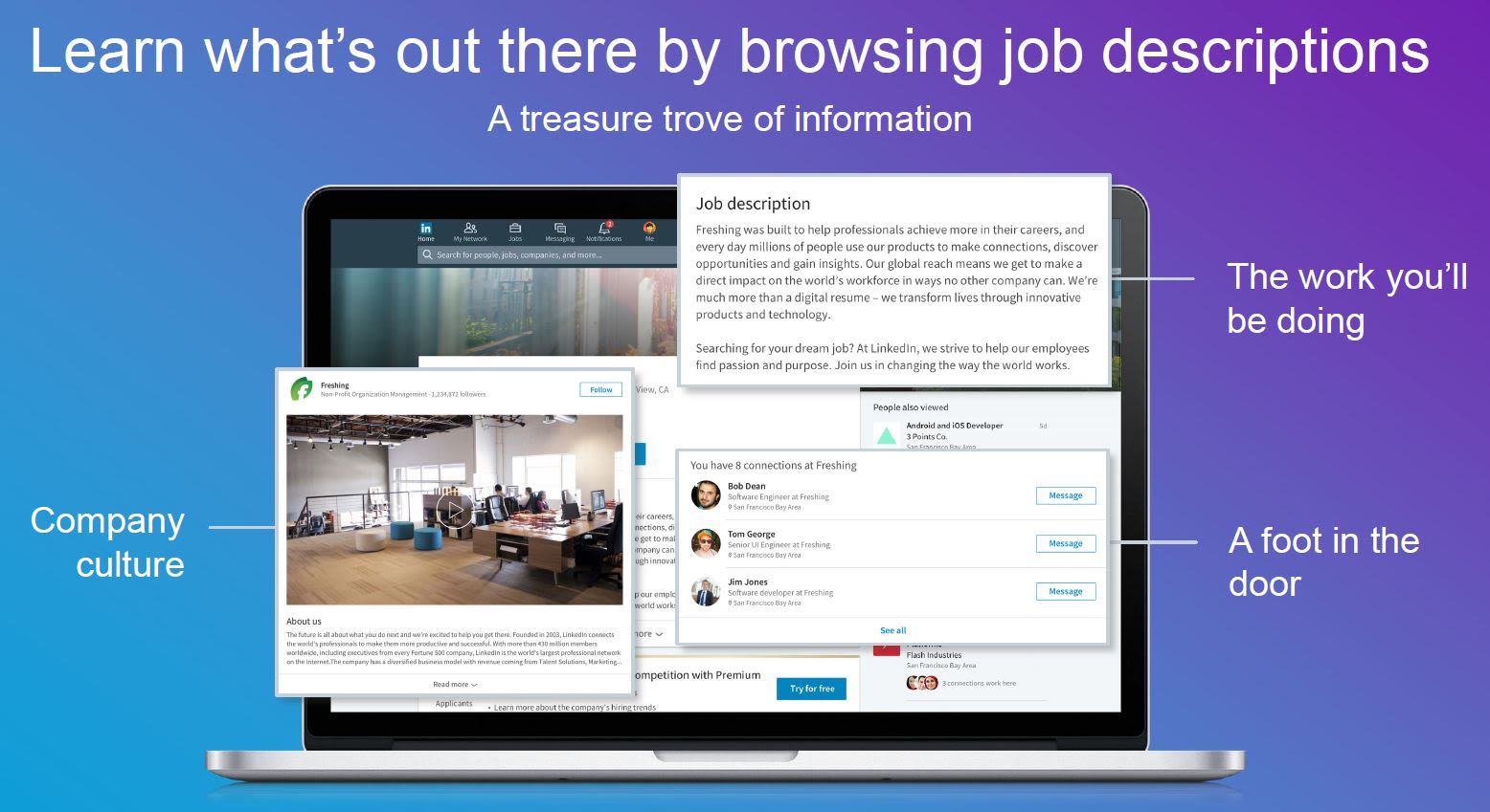 It’s a treasure trove of information. You can learn about what jobs are out there by browsing job descriptions and researching your industry by looking at what they are posting. This is especially helpful when applying for a jobs.