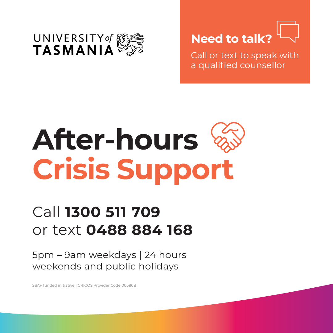 The University Counselling Service offers confidential and professional counselling to students experiencing a range of academic, mental health and personal concerns including (but not limited to) anxiety, stress, depression, motivational problems and relationship difficulties. If you would like support in managing your anxiety and making meaningful connections with others, then UTAS counsellors can support you.