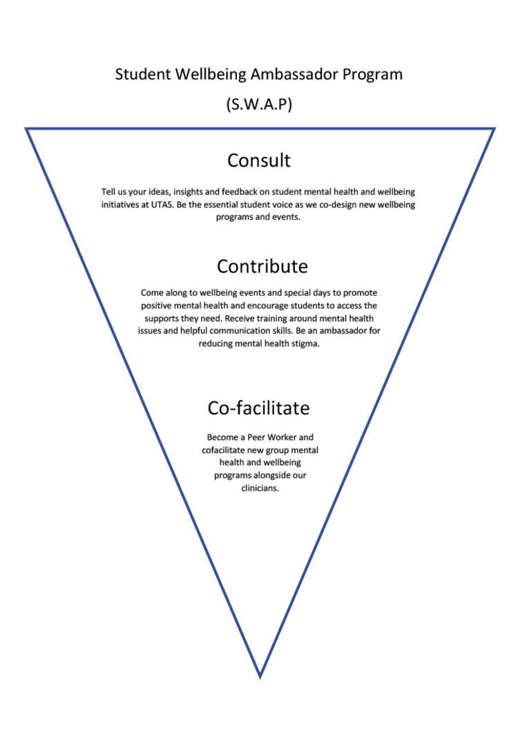 The Student Wellbeing Ambassador Program (S.W.A.P) is for current students at the University of Tasmania who are interested in contributing their ideas, participating in events, and receiving training in student wellbeing and mental health. Our Ambassadors are a team of friendly student volunteers who are passionate about enhancing the mental health and wellbeing for all UTAS students. They play a crucial role in being the voice for students, co-designing wellbeing programs, and reducing mental health stigma.